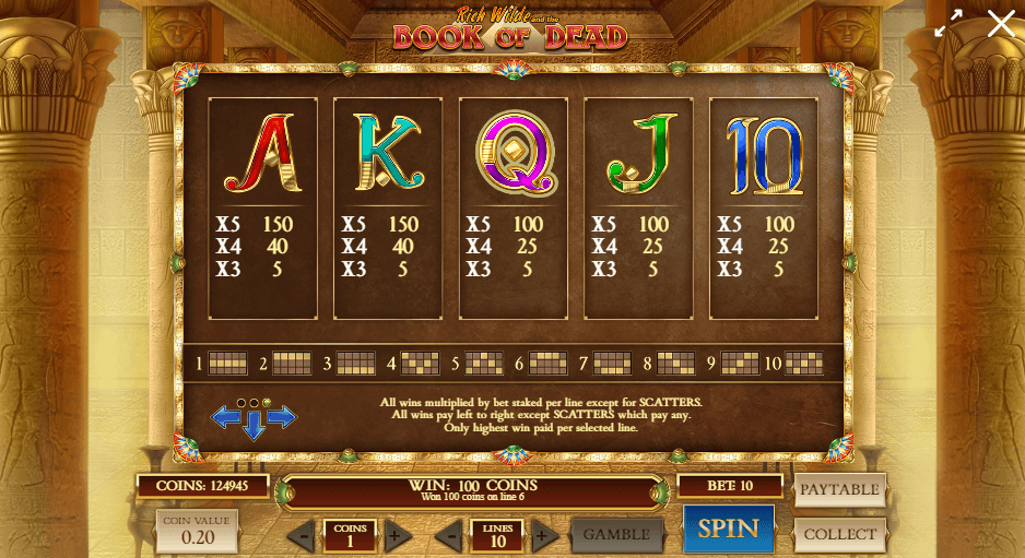 A Book of Dead, mint azt már korábban is említettem, egy 96,21%-os RTP aránnyal rendelkezik, amely kiemelkedően az átlag felett van más nyerőgépekhez viszonyítva. Ez azt jelenti, hogy a befizetett összegnek átlagban a 96,21%-át látják vissza a játékosok. Hozzávetőlegesen, a legtöbb nyerőgép esetében előforduló RTP 94% és 96% közé esik. Ezért megállapíthatjuk, hogy a Book of Dead kitűnő választás minden játékos számára, de legfőképpen azok számára, akik alacsony téttel és nagy nyerési eséllyel szeretnének játszani. De, nem csak ezek a játékosok találják meg itt a nekik való játékot, hanem minden játékos aki izgalmas történelmi köntösbe ültetett játékot szeretne játszani, jó sok nyereménnyel ellátva.