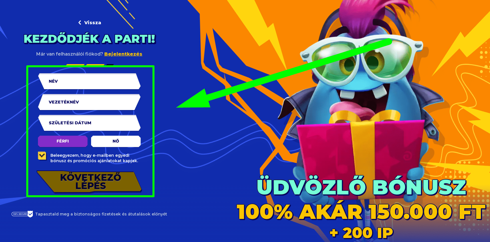 | Üdvözlő bónusz | 100 % akár 150.000 Ft + 200 Ingyenes Pörgetés |