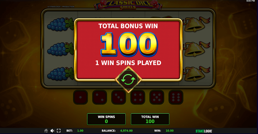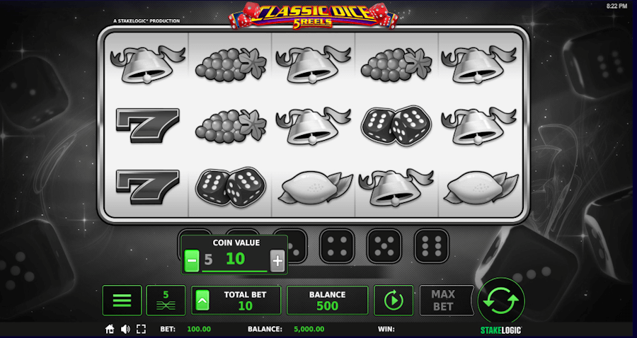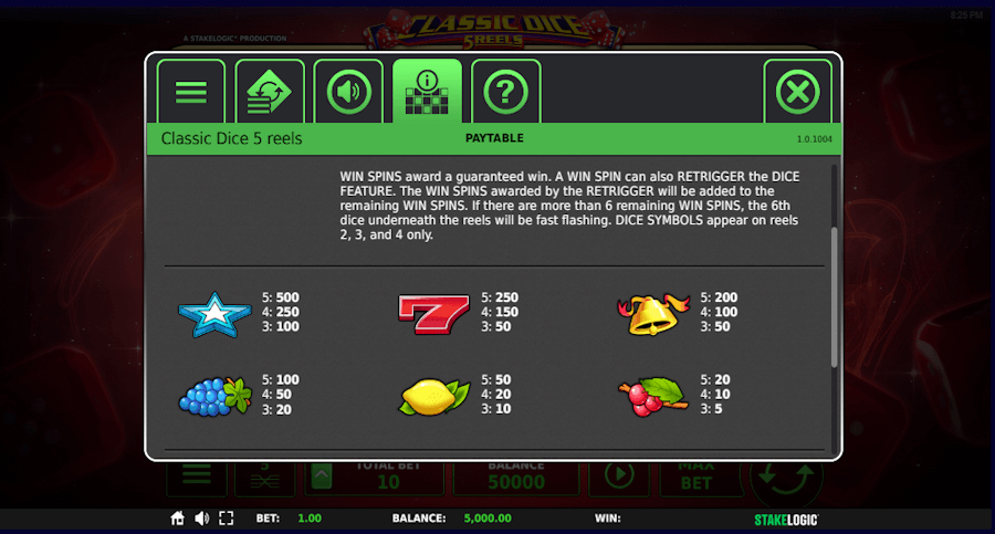 A Classic Dice játékban 5 tárcsát látni, amik minden egyes pörgetésnél többszörös lehetőséget adnak egy nyerő kombinációhoz. Egy nyerővonalon minimum 3 szimbólumnak kell megegyeznie egy-egy nyereményhez. A csillag a kedvenc, hiszen ha 5 darabot pörgetünk ki, akár 500 érmés is lehet a nyeremény. A táblázatban látható, hogy melyik szimbólummal mekkora nyereményre számíthatunk.