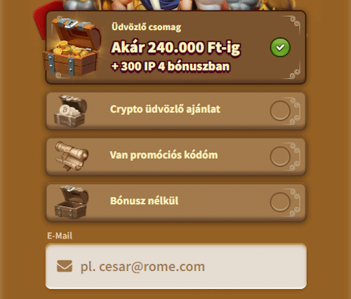 Válaszd ki az Üdvözlő Bónusz típusát, és add meg a későbbi bejelentkezéshez használatos adatokat (itt láthatsz egy ókori római e-mail cím példáit is)