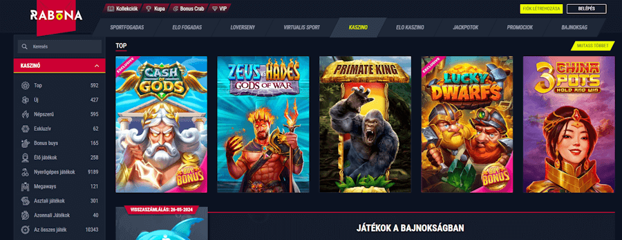 Mikor először jársz a Rabona kaszinó honlapján, szinte azonnal feltűnik hogy a weboldal profiljának nagy részét a sportfogadás teszi ki, de vessük szemügyre mi mást rejteget az oldal. A weboldal modern stílusú, mind grafikailag, mind pedig a feliratot tekintve. Sötét szürke háttéréhez passzol a hivalkodó piros és sárga logó. Vezérlést tekintve gyorsan reagál, így könnyedén válthatsz a különböző szekciók között.
